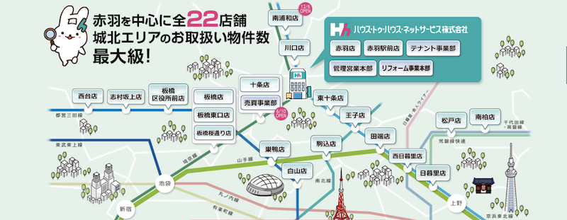 ハウス・トゥ・ハウス・ネットサービス株式会社は、東京北部(城北エリア)と埼玉南部のエリアに特化して、不動産売買仲介や賃貸仲介、賃貸管理、リフォームなどを行なっている不動産会社です。
