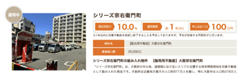 想定利回り10.0%、運用期間1年のファンドであり、1口100万円から出資者を募っています。
