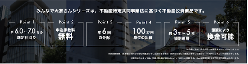 平均利回り6.0〜7.0%、年6回の配当金の分配、100万円からの少額投資、3〜5年の短期運用、譲渡による換金可能な点をウリにしています。