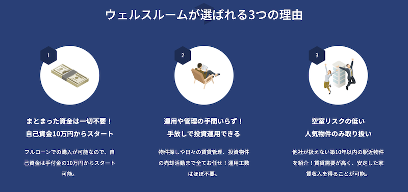 Wealth Roomでは、東京や大阪エリアに特化して、築10年未満の築浅かつ駅徒歩5分圏内の収益性の高い物件を多数取り扱っているそうです。フルローンで購入できるため、手付金10万円の自己資金で不動産投資を始められるとアピール。
